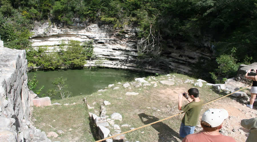 Die Heilige Cenote (Cenote Sagrado) ist ein mit Wasser gefüllter Erdfall mit steilen Wänden. Sie misst einen Durchmesser von 60 m. Auf ihren Grund, in etwa 40 m Tiefe, fand man zahlreiche Opfergaben, neben Keramik, Edelsteinen und Edelmetallen auch 50 menschliche Skelette. Vermutlich wurden in Notzeiten hier dem Regengott Chac Menschen geopfert. |